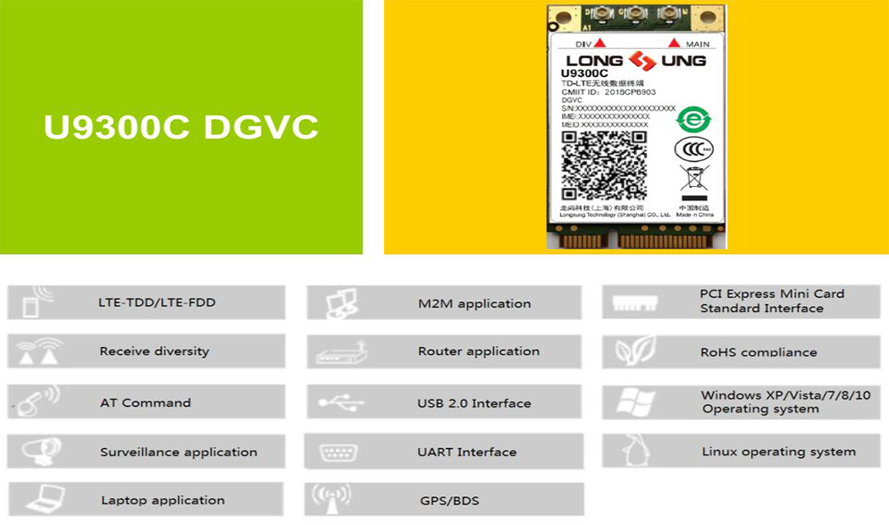 U9300C DGVC 是龍尚科技推出的一款 LTE Cat4 無線通信模塊,內(nèi)置豐富的網(wǎng)絡(luò)協(xié)議,集成多個(gè)標(biāo)準(zhǔn)接